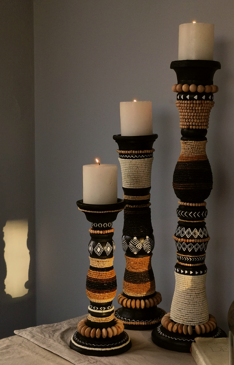 Crafted from turned wood, our candle stands feature an African-inspired beaded finish, seamlessly blending traditional artistry with modern elegance.