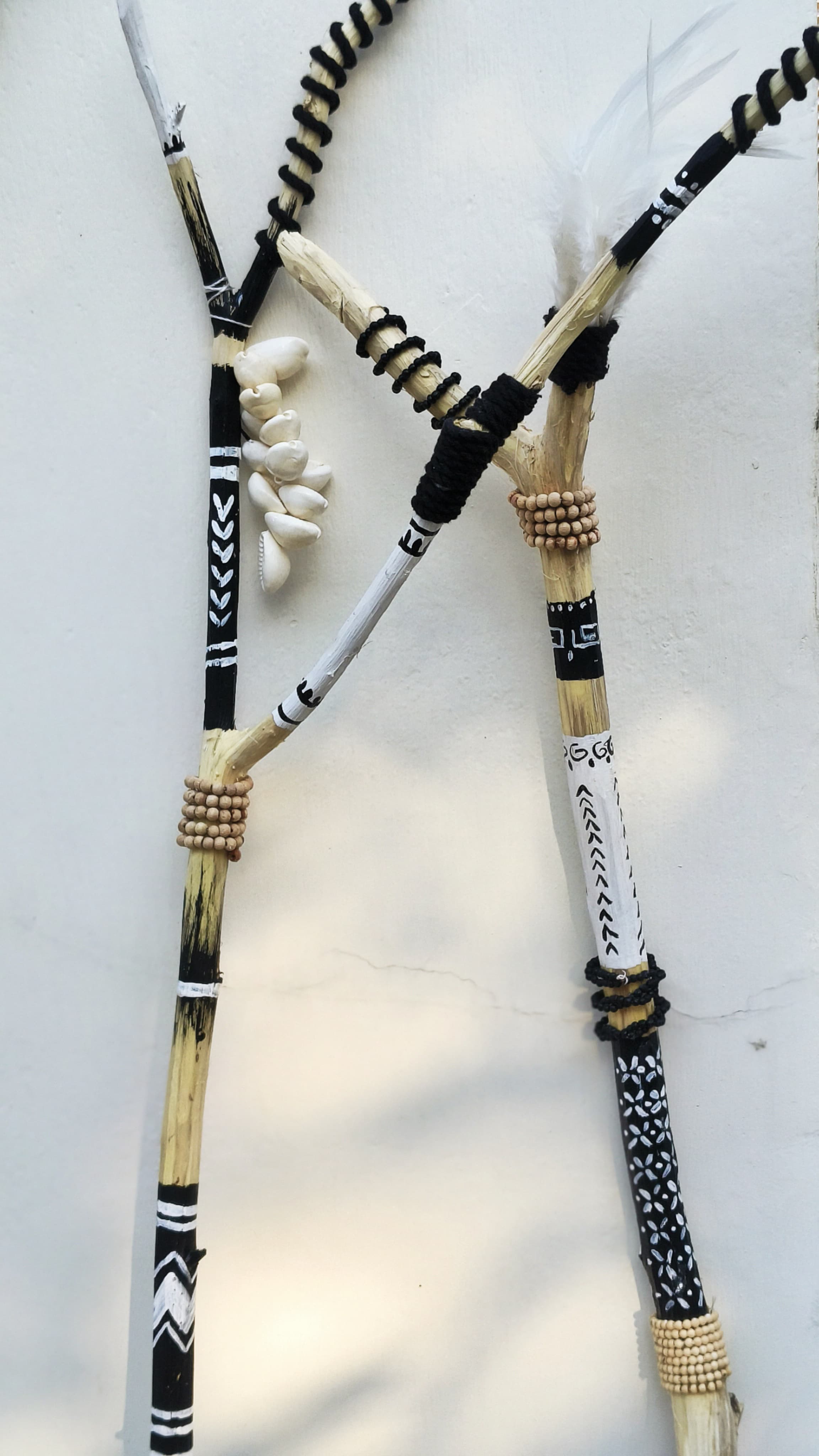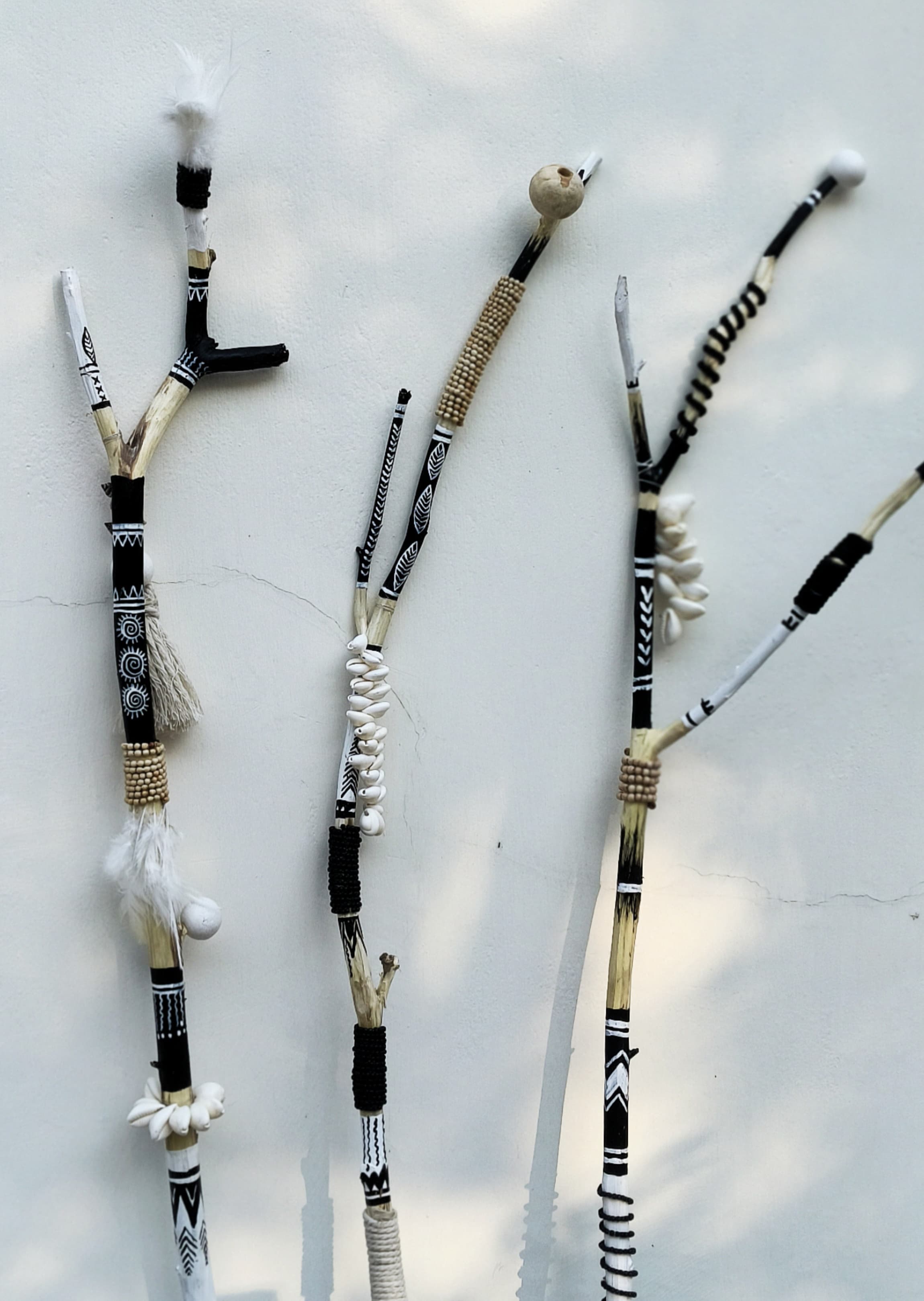 Hand-painted natural branches featuring intricate African patterns serve as a striking fusion of art and nature. Embellished with natural wooden beads, cowrie shells, and delicate feathers, these branches exude a tribal yet sophisticated aesthetic. Each piece embodies cultural storytelling, adding a raw, earthy charm to any space..
