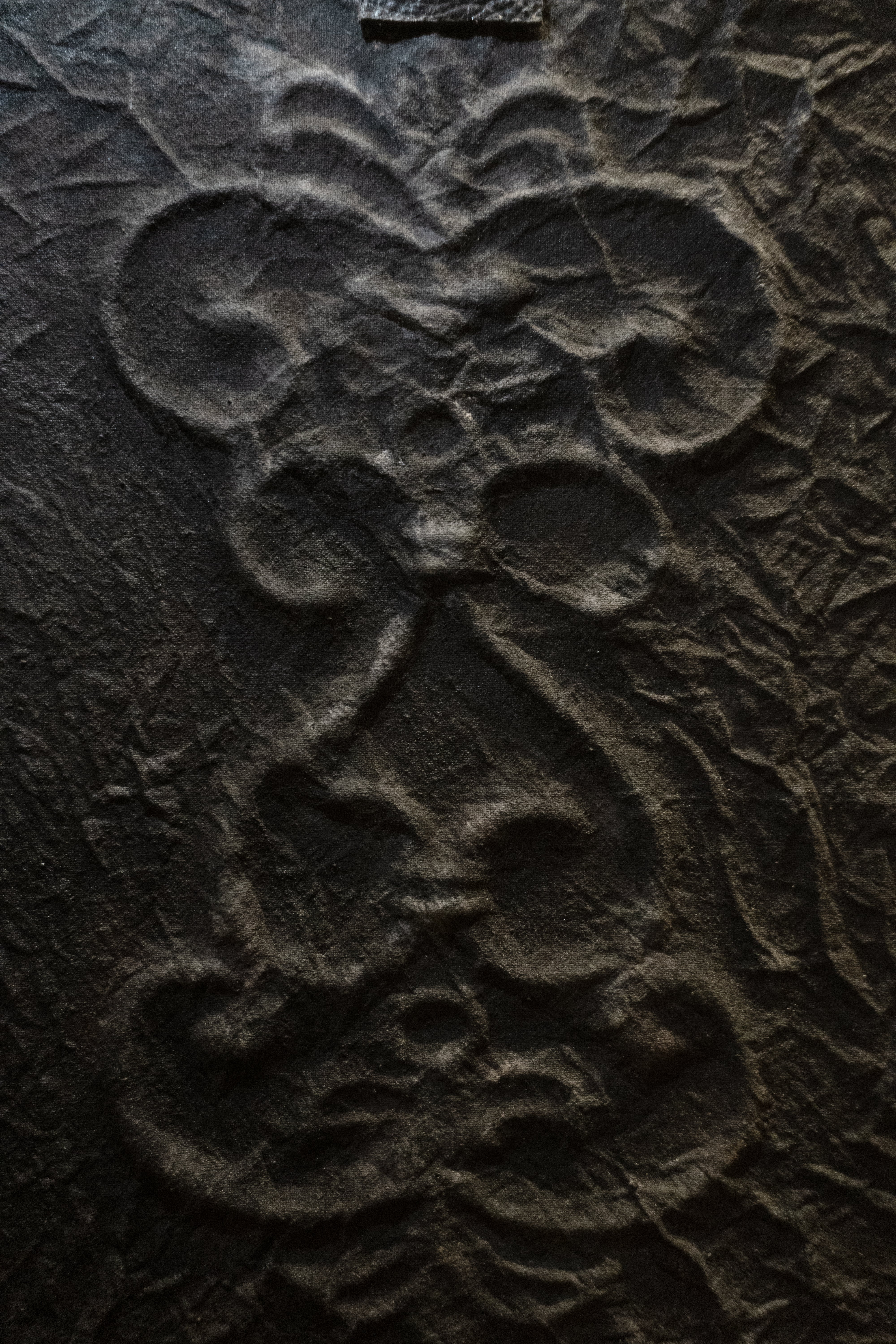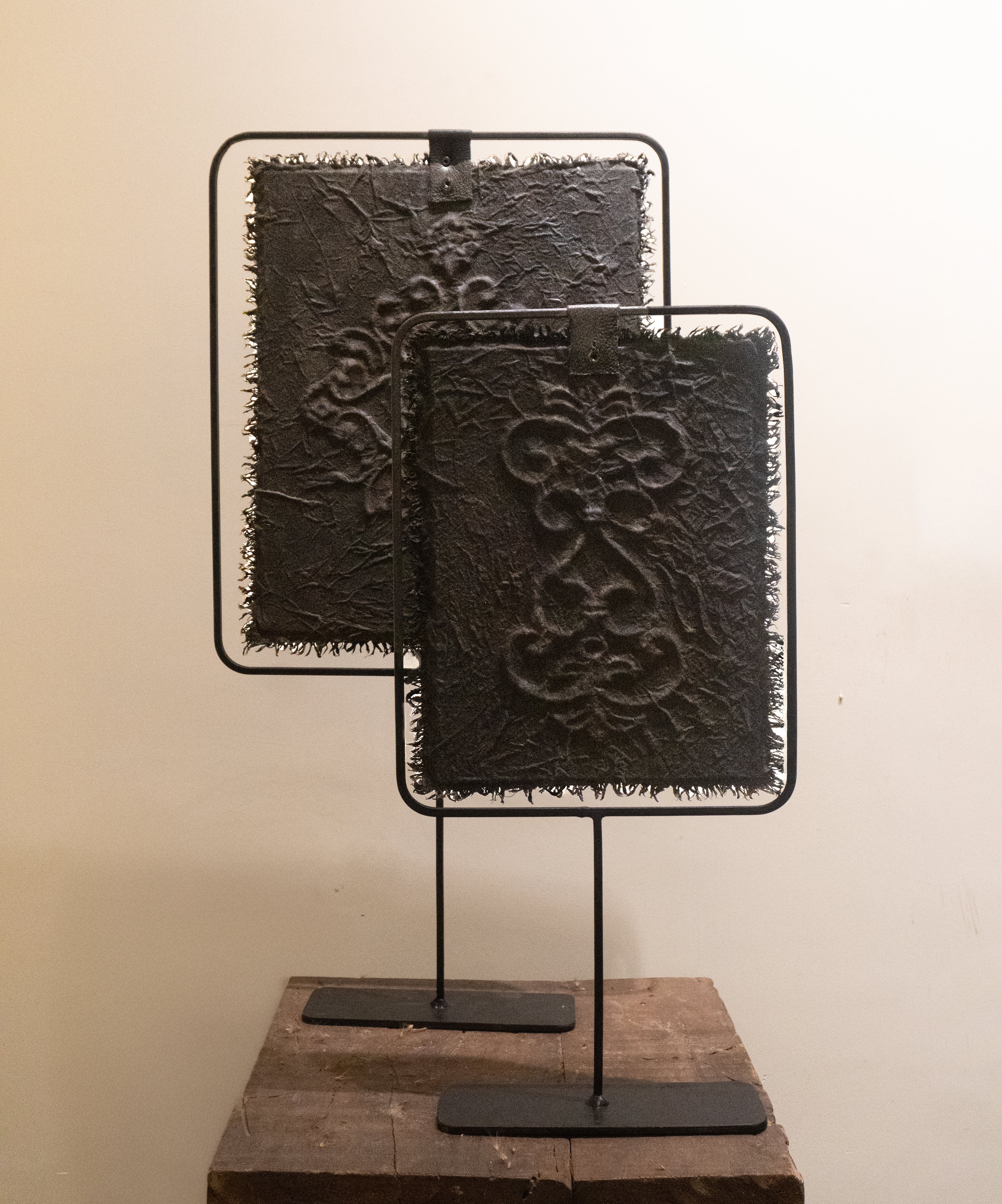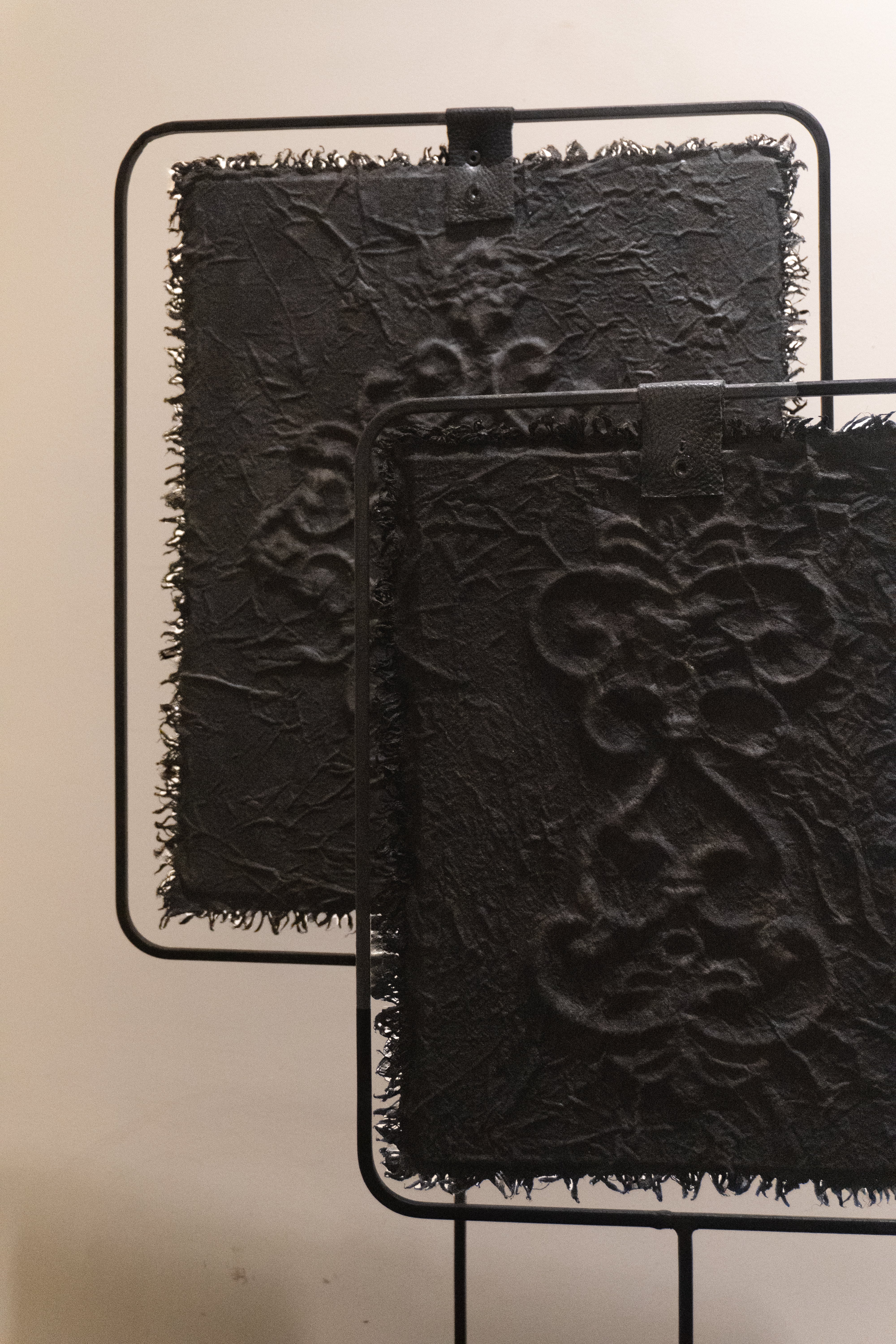 A play of fabric and metal, this mix-media console art piece brings depth and quiet drama to your space. With intricate patterns and frayed edges, it invites a closer look and sparks a story of material and form.