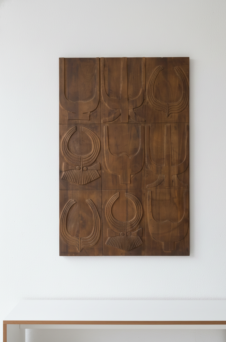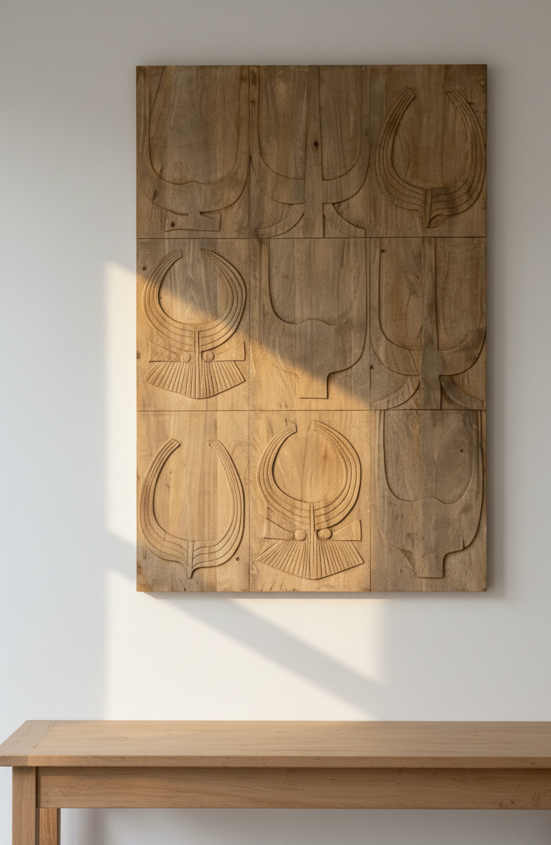 This hand-carved wooden panel features nine distinct motifs inspired by traditional Naga tribal design. Each motif carries the raw, rhythmic geometry and symbolic character typical of Naga craft, celebrating themes of nature, protection, and ancestral heritage. Carved from seasoned wood and finished to preserve its earthy grain, the panel holds a striking presence — textured, tactile, and deeply rooted in Indigenous artistry.