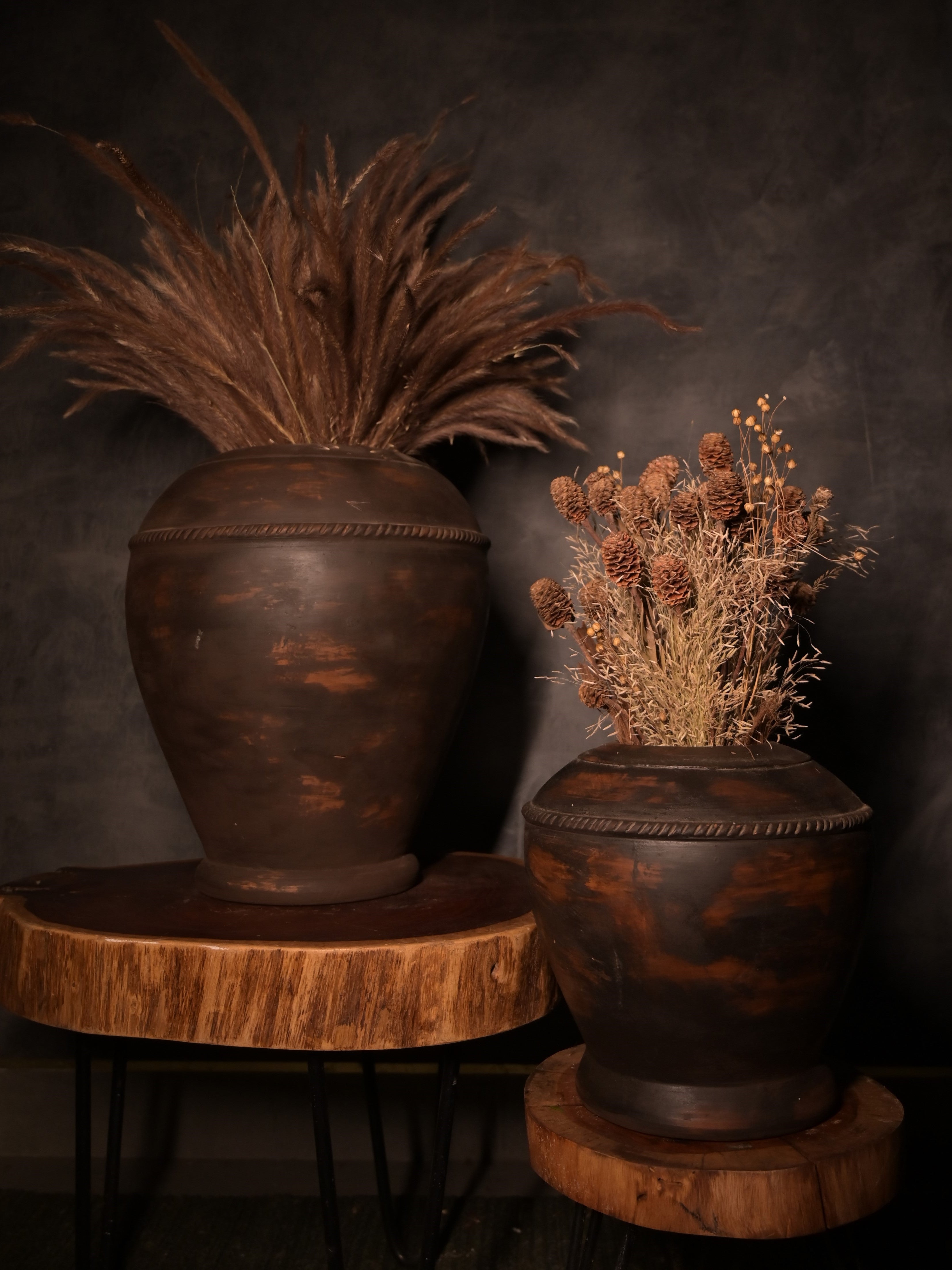 Our handcrafted terracotta urn with a rich natural wood texture is perfect to fill with a bunch of dried flowers